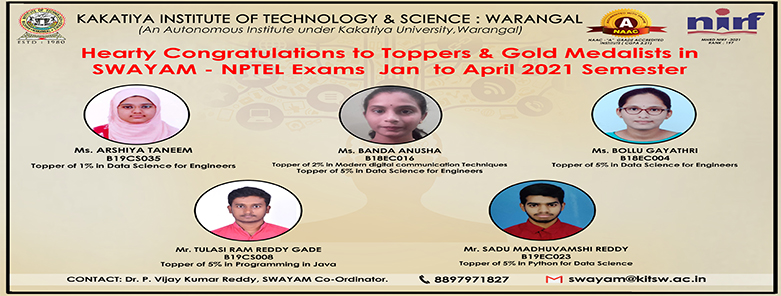 Hearty Congratulations to Toppers and Gold Medalists in SWAYAM - NPTEL January to April 2021 Semester Examinations.