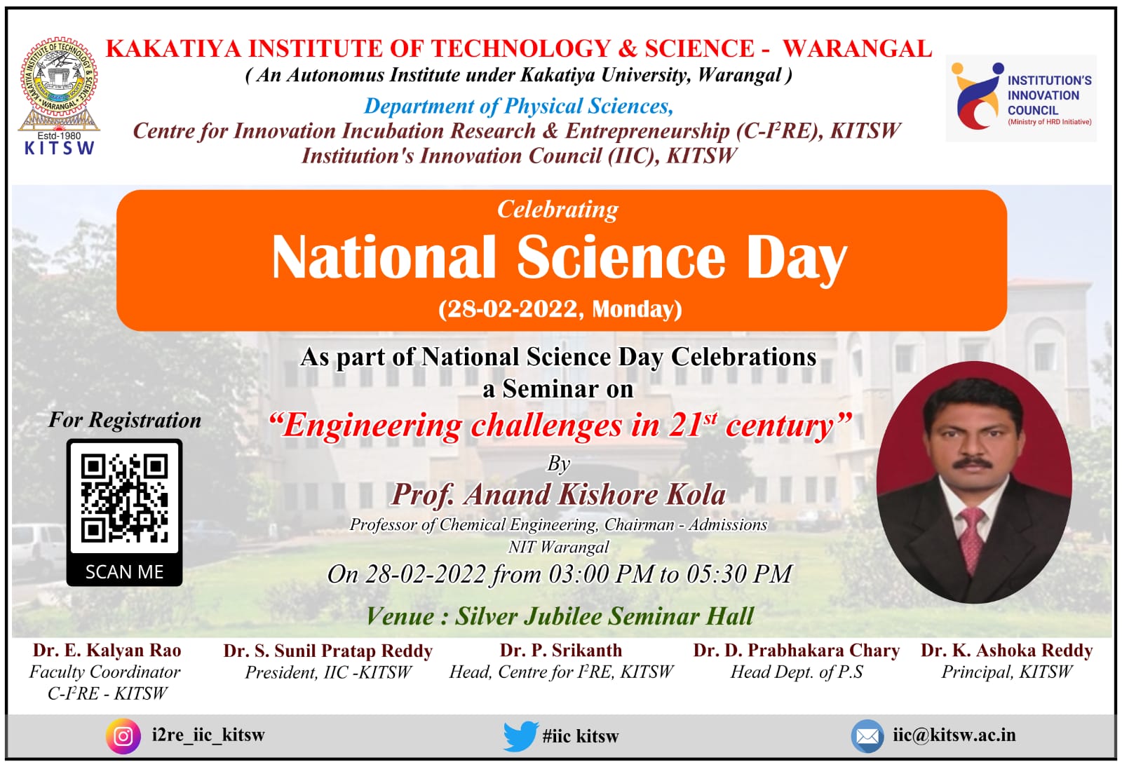 As part of National Science Day Celebrations the Department of Physical Sciences is conducting a Seminar on Engineering challenges in 21st century,by Prof. Anand Kishore Kola,NIT Warangal on 28.02.2022 from 03:00 PM to 05:30 PM.