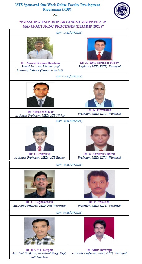 ISTE Sponsored One Week Online Faculty Development Programme (FDP) on “EMERGING TRENDS IN ADVANCED MATERIALS & MANUFACTURING PROCESSES (ETAMMP-2021)”