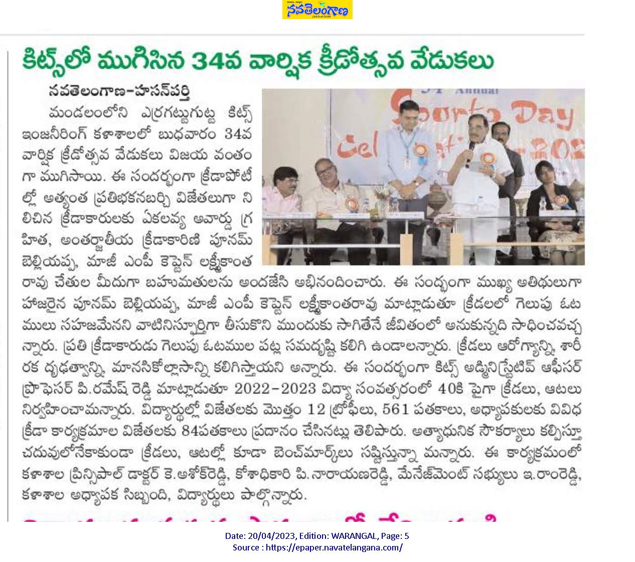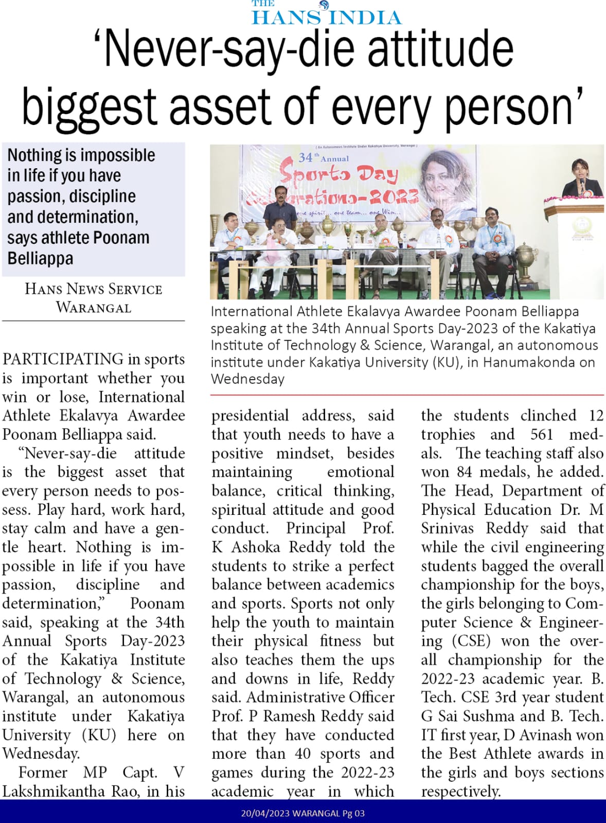 International Athlete Ekalavya Awardee Poonam Beliappa addressed at the 34Th Annual Sports day-2023 held on 18th April, 2023 @ KITSW.