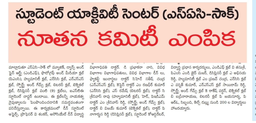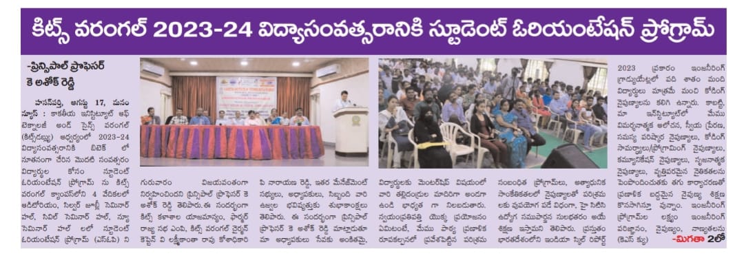 Student Orientation Programme for B.Tech. I year students is held on 17th August, 2023 @ KITSW