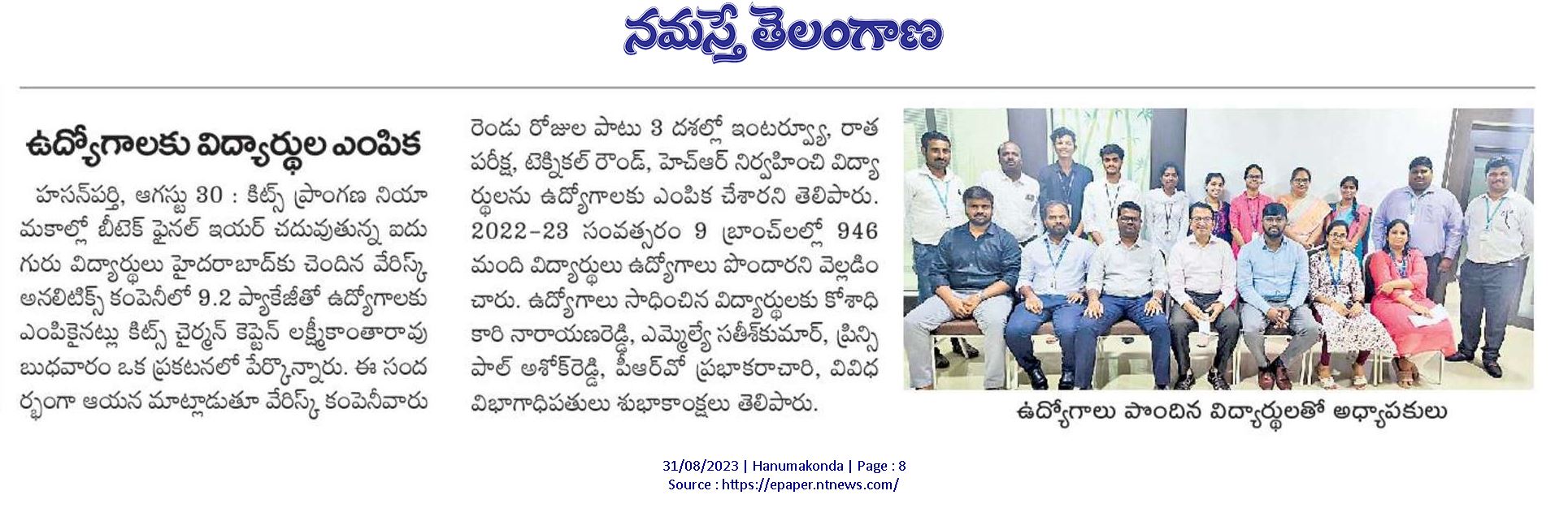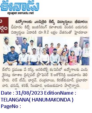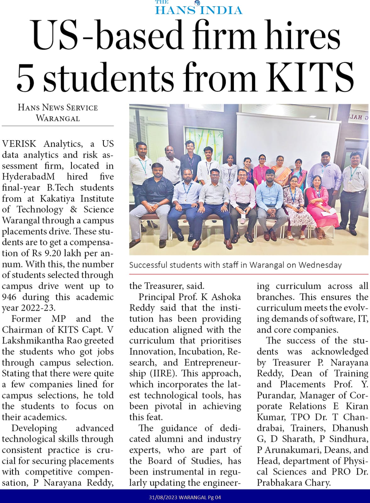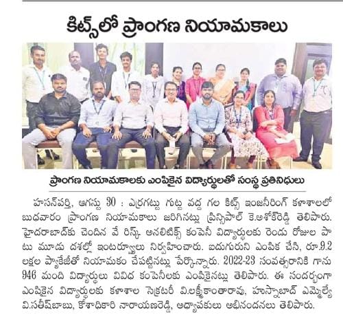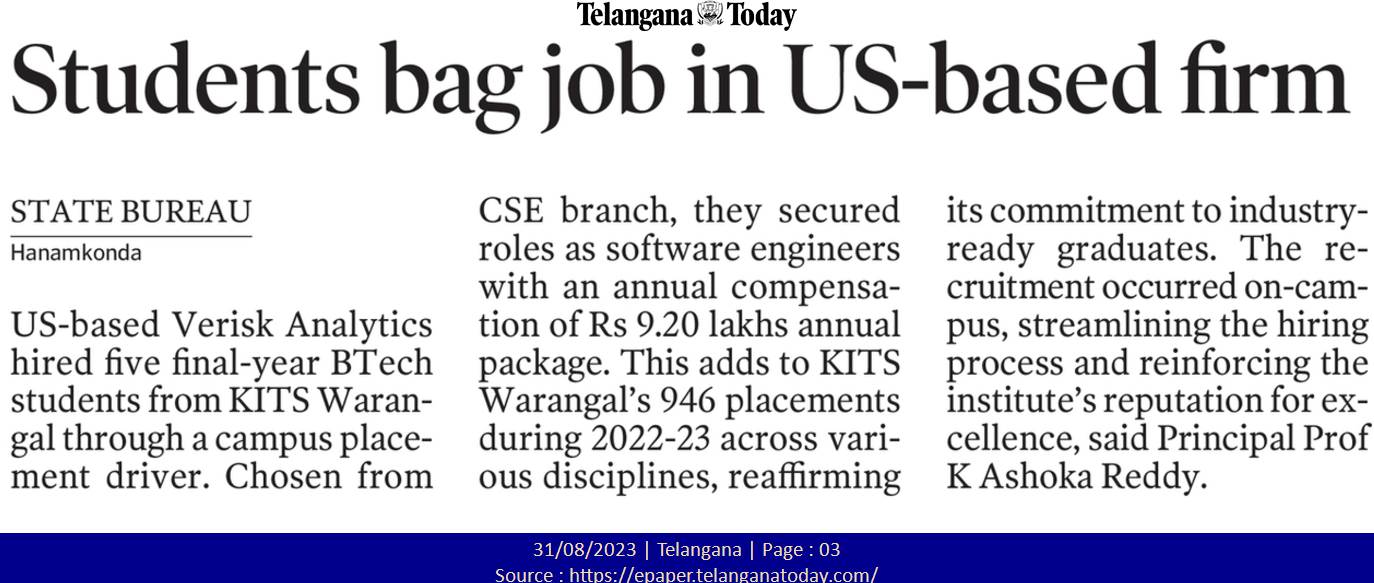 US-based Verisk Analytics hired 5 final year B.Tech students in a campus placement drive@ KITS, Warangal