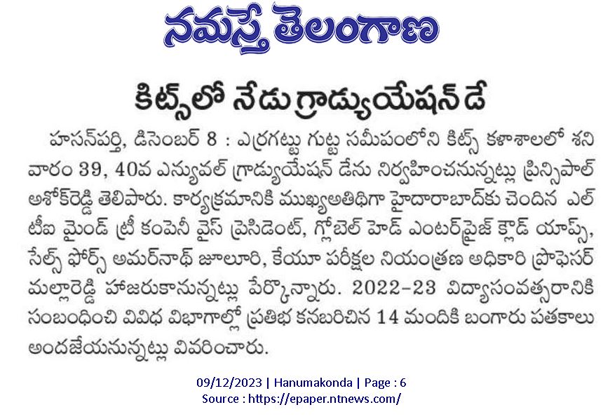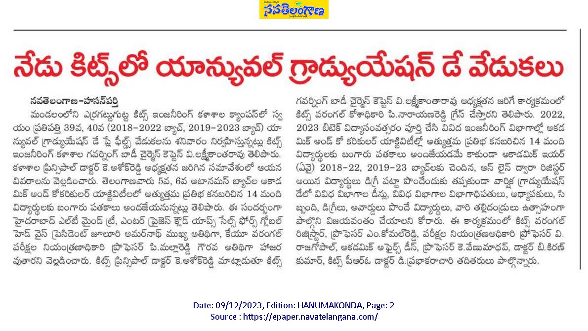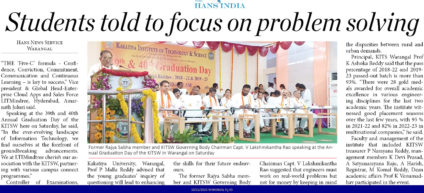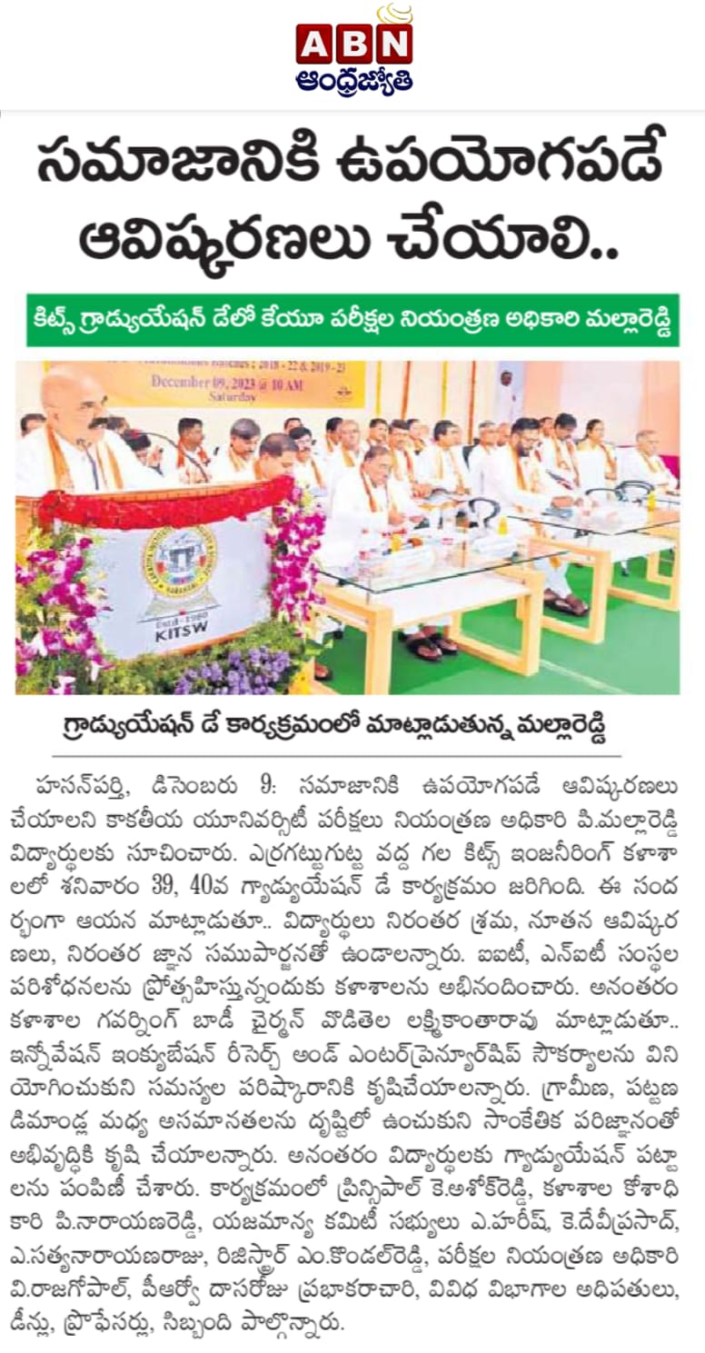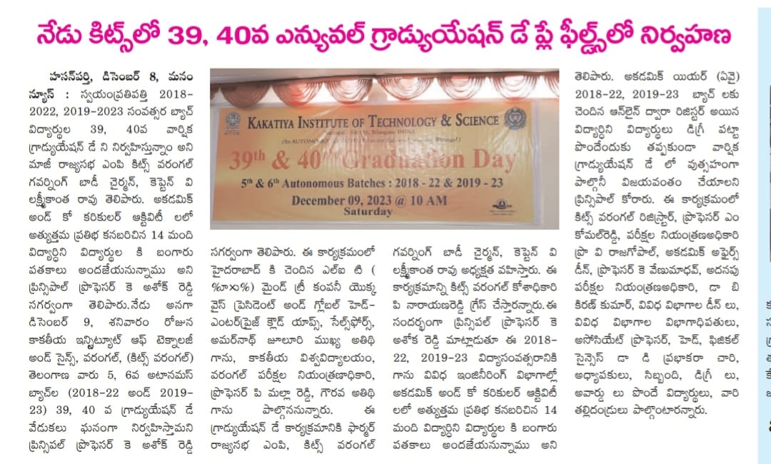 KITS, Warangal was celebrated its 39th and 40th Graduation Day for the Autonomous batches of 2018-22 and 2019-23 on 9th December, 2023.