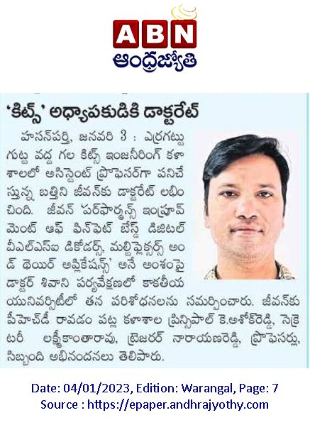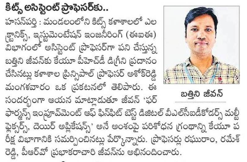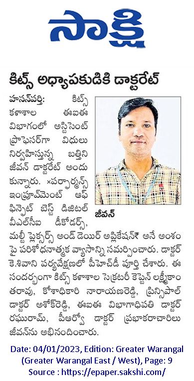 Sri B.Jeevan Assistant Professor of EIE, has been awarded Doctorate of Philosophy (Ph.D) degree by the Kakatiya University, Warangal, Telangana.