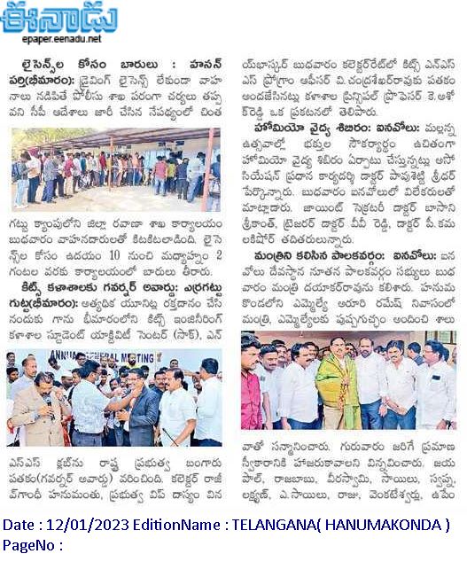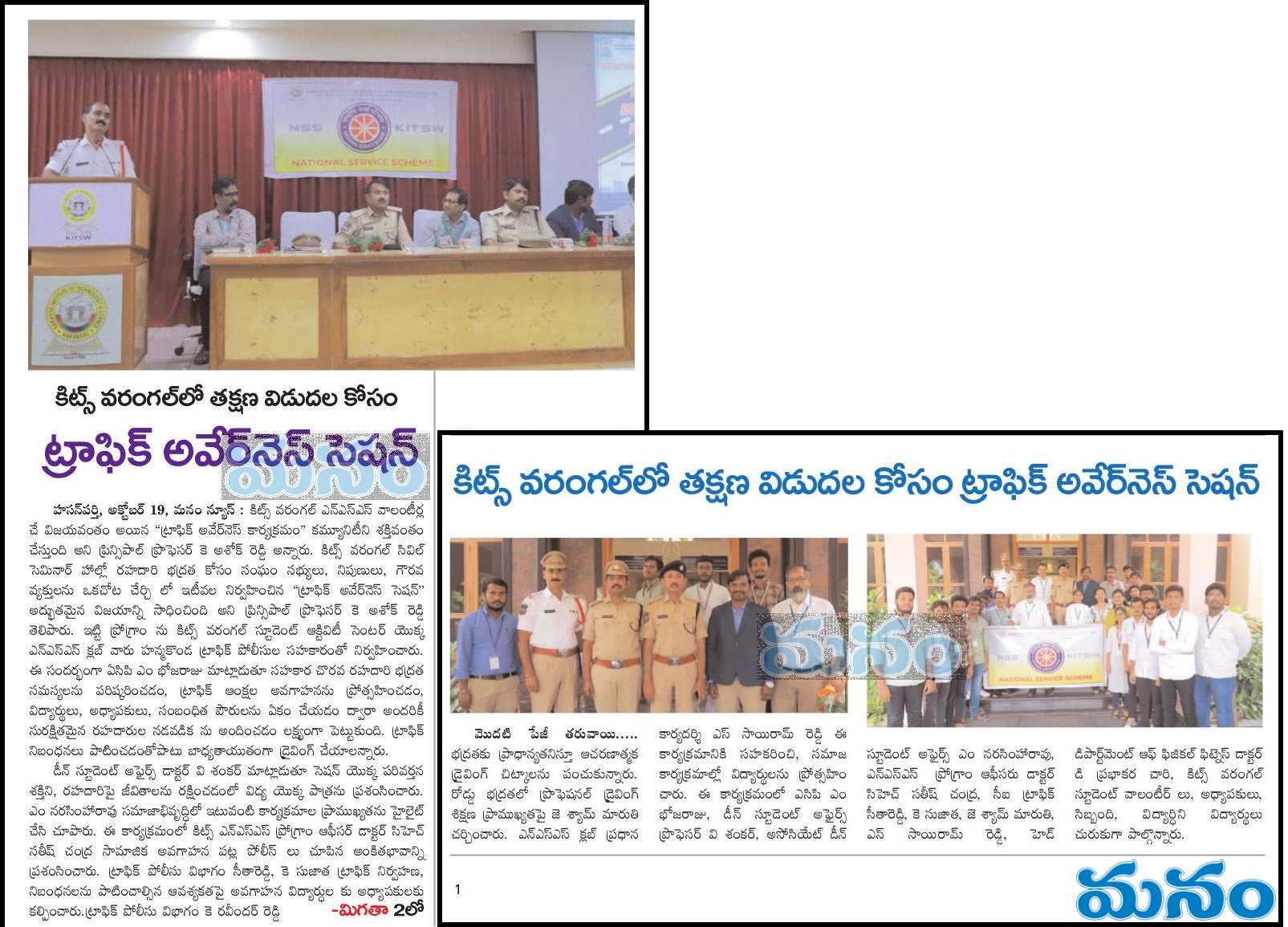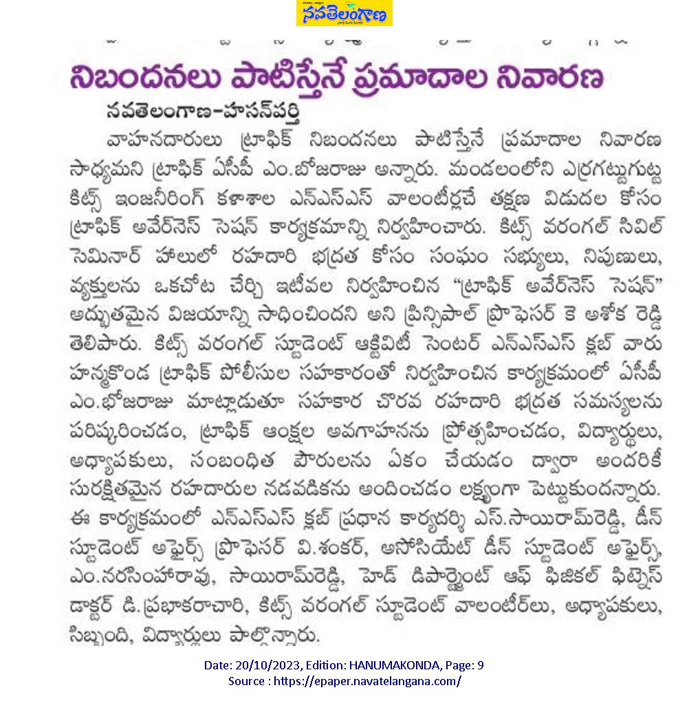 NSS, Student Activity Centre(SAC), KITSW organised a "Traffic Awareness Session" programme in association with Hanamkonda City Traffic Police on 19th October, 2023 @ KITS, Warangal