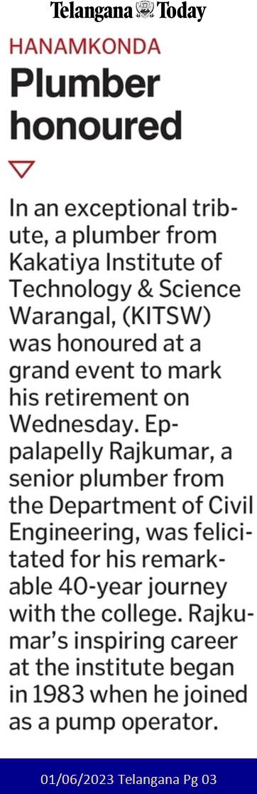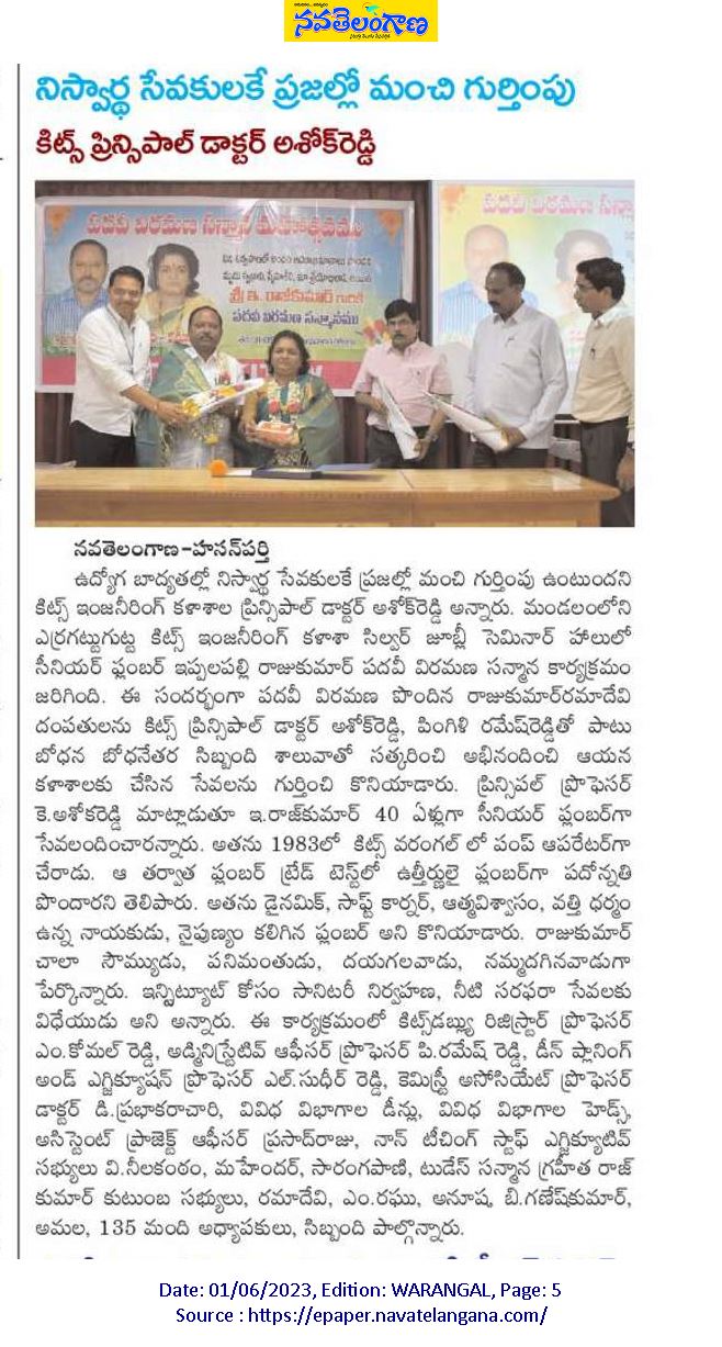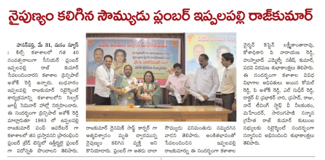 Sri E.Raj Kumar, Plumber, KITS-Warangal, was honoured at a grand event to mark his retirement on 31st May, 2023.