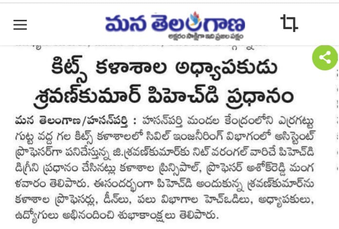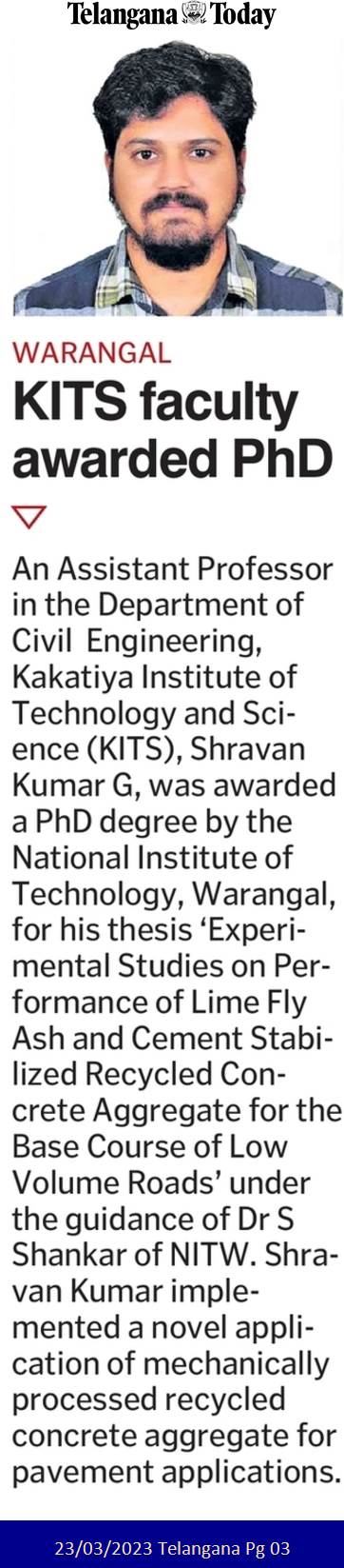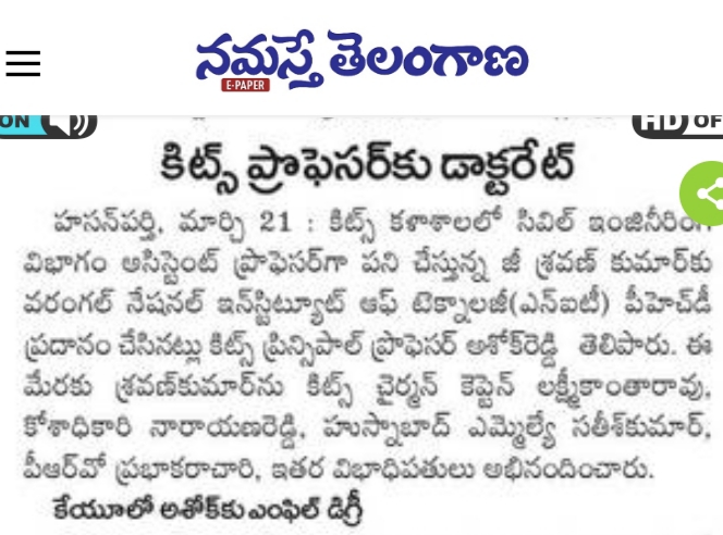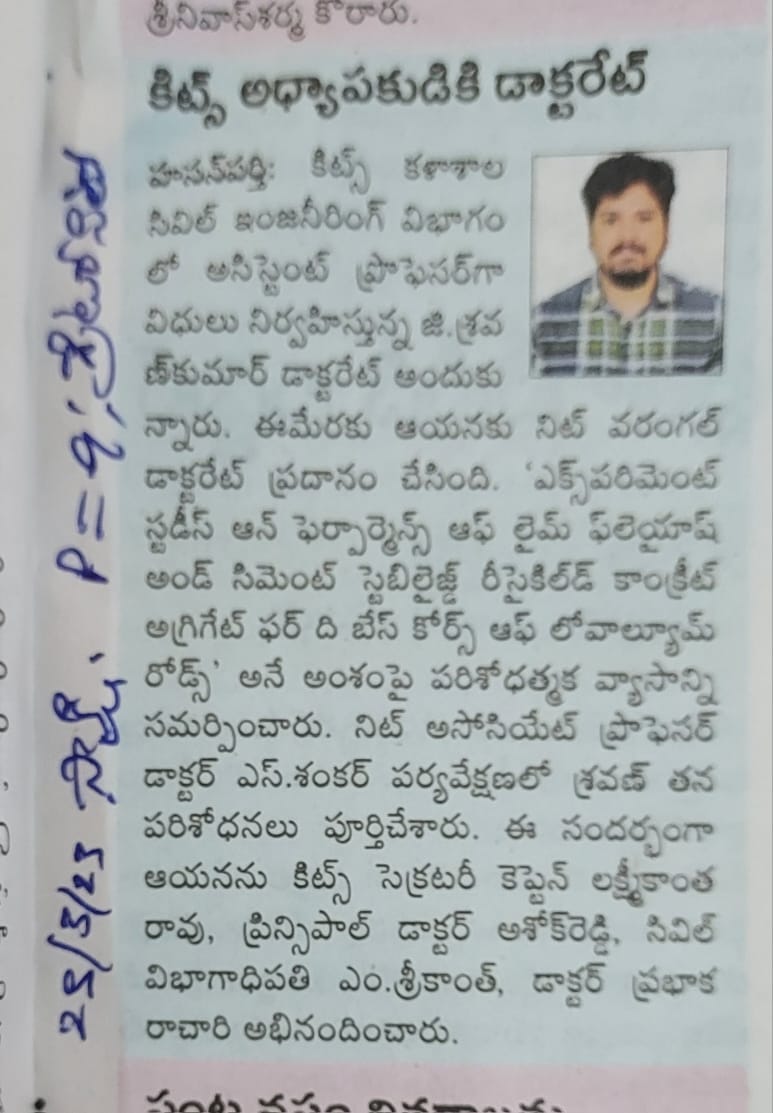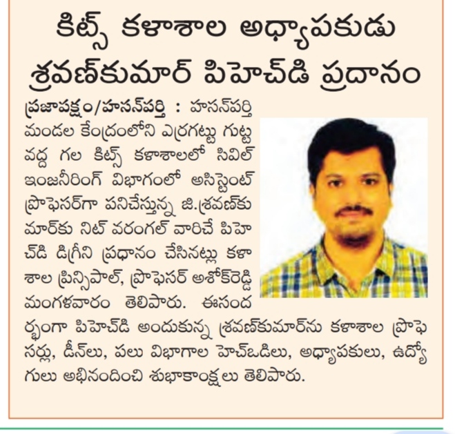 Sri Shravan Kumar G. Assistant Professor of Civil Engg., has been awarded Doctorate of Philosophy (Ph.D) degree by the NIT, Warangal
