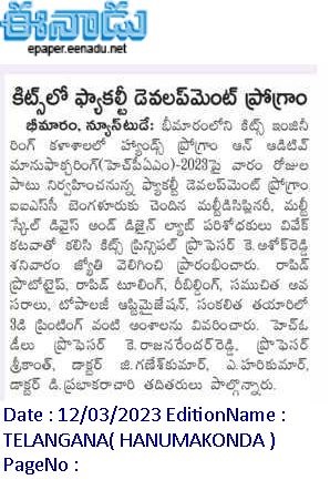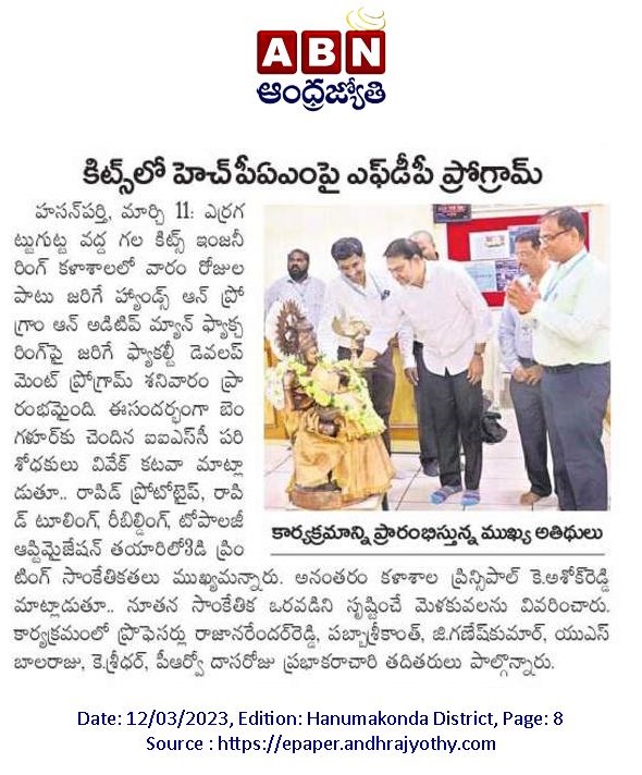 One week Faculty Development Programme on "Hands on Program Additive Manufacturing(HPAM-2023)" is organised by department of Mechanical Engg., KITSW in association with Shree Rapid Technologies, Bangalore during 11th and 16th March, 2023 @ KITSW.