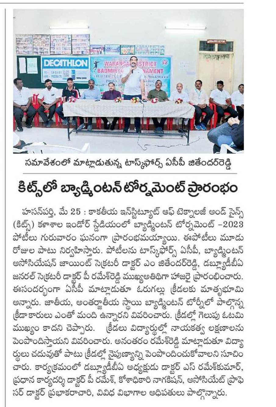 The three-day district badminton championship for boys, girls, men and women got underway at the Indore stadium, KITS, Warangal, during 25th - 27th May, 2023.