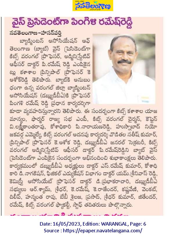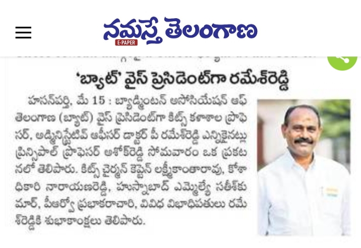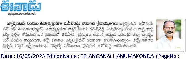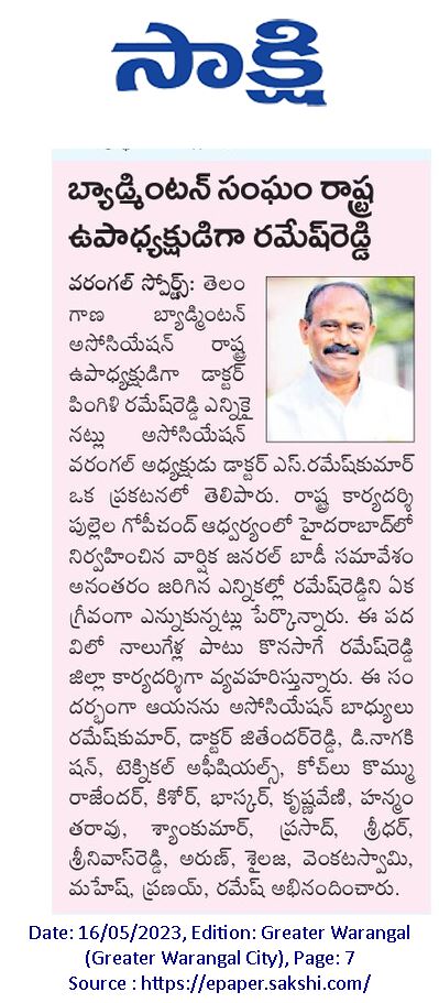 Dr. P Ramesh Reddy has been elected as the vice president of the Badminton Association of Telangana (BAT).