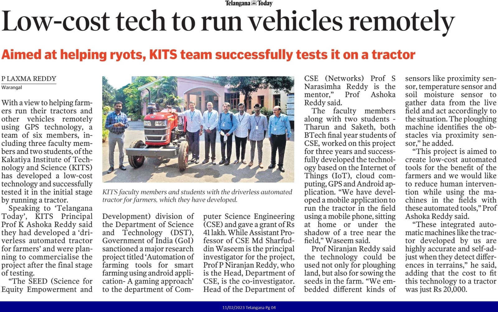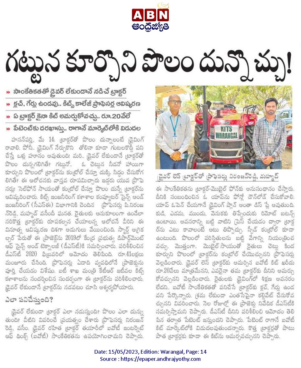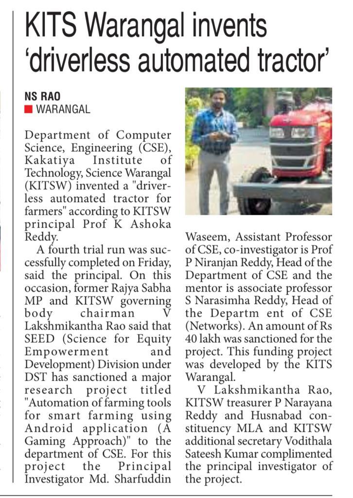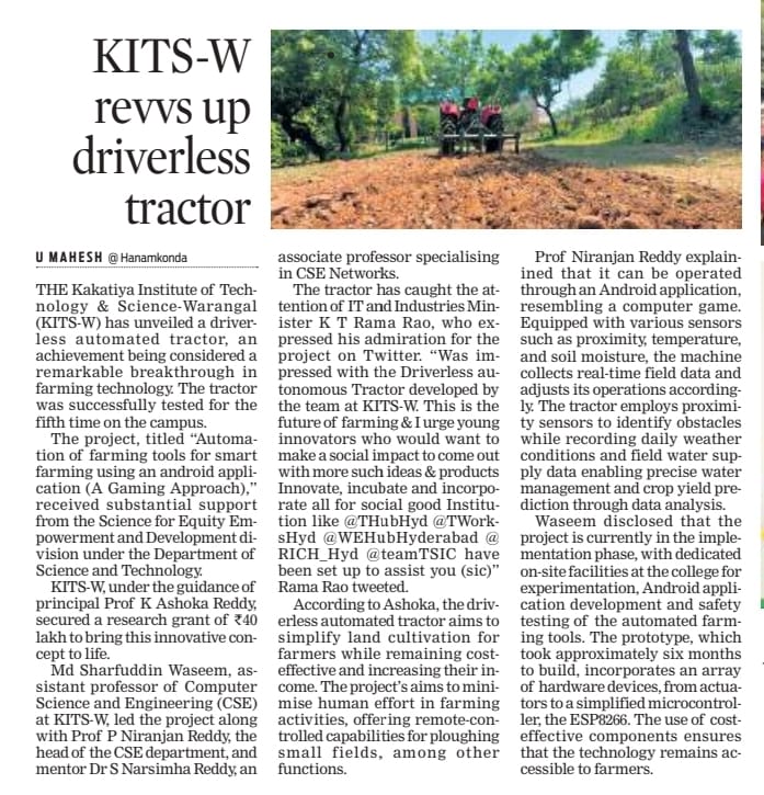 Farming made easy: The Department of CSE, KITS Warangal staff develops interface for driverless tractor Farmers can use the remote-controlled tractor to plough small fields