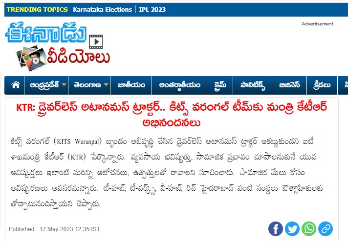 Department of CSE, KITSW faculty have developed a low-cost technology and successfully tested by running a tractor remotely using GPS technology on 10th February, 2023.