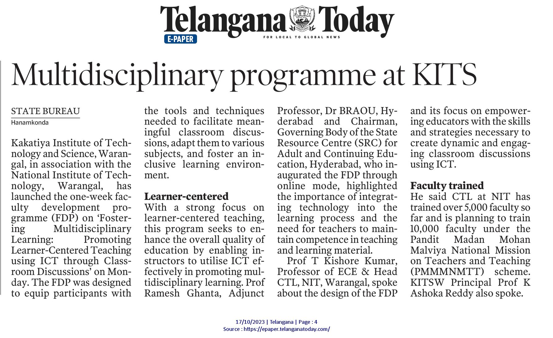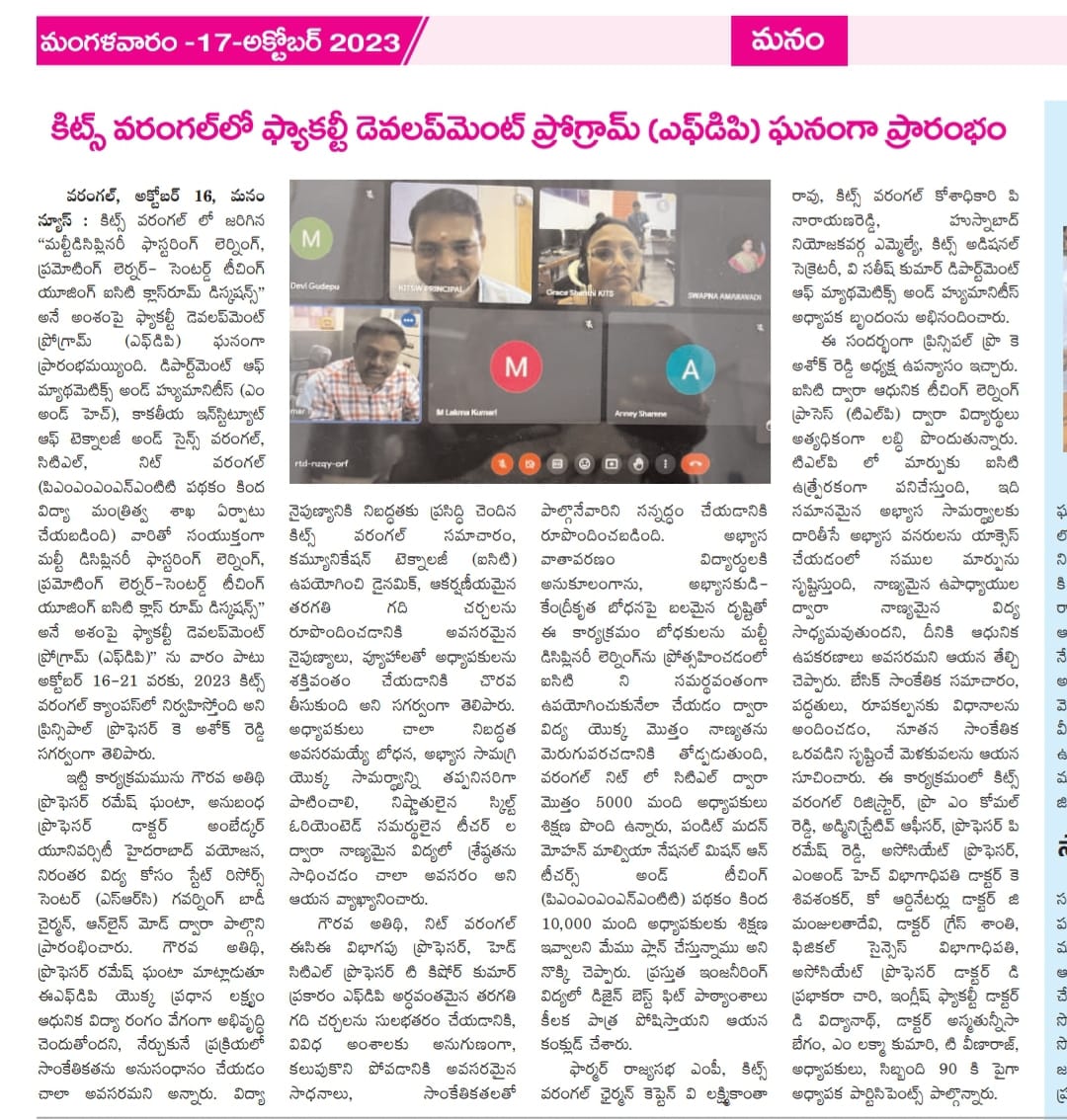 One week Online Faculty Development Programme(FDP) on “Fostering Multidisciplinary Learning: Promoting Learner- Centred Teaching through Classroom Discussions” organized by Department of Mathematics and Humanities in association with Centre for Training and Learning (CTL), NIT Warangal from 16th to 21st October,2023 @ KITS, Warangal