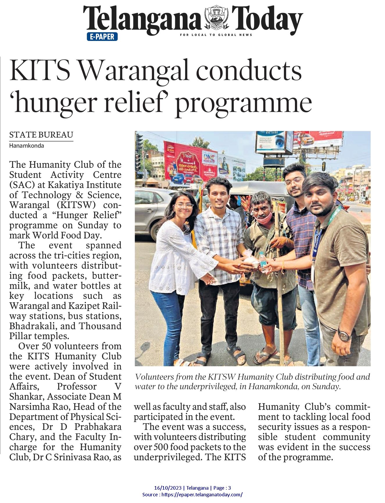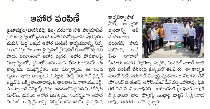Student Activity Centre(SAC), KITSW organised a "Hunger Relief" programme on the occasion of World Food Day on 15th October, 2023 @ KITS, Warangal