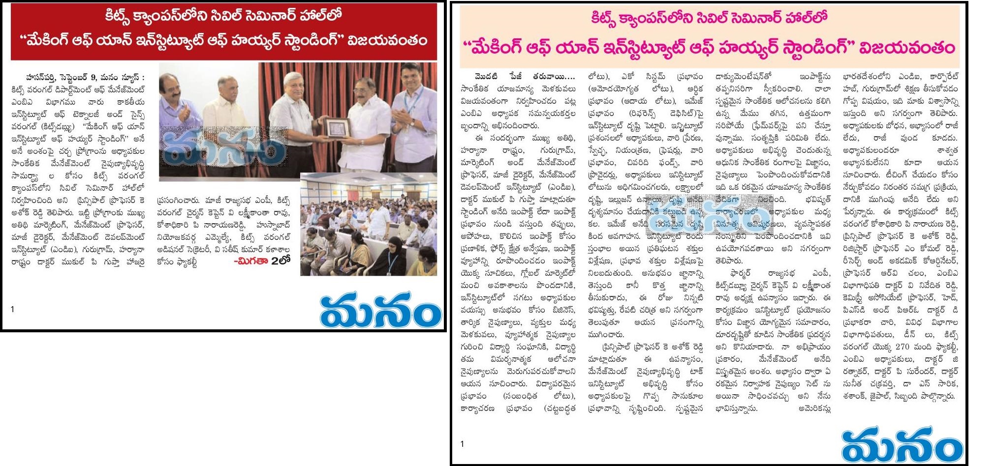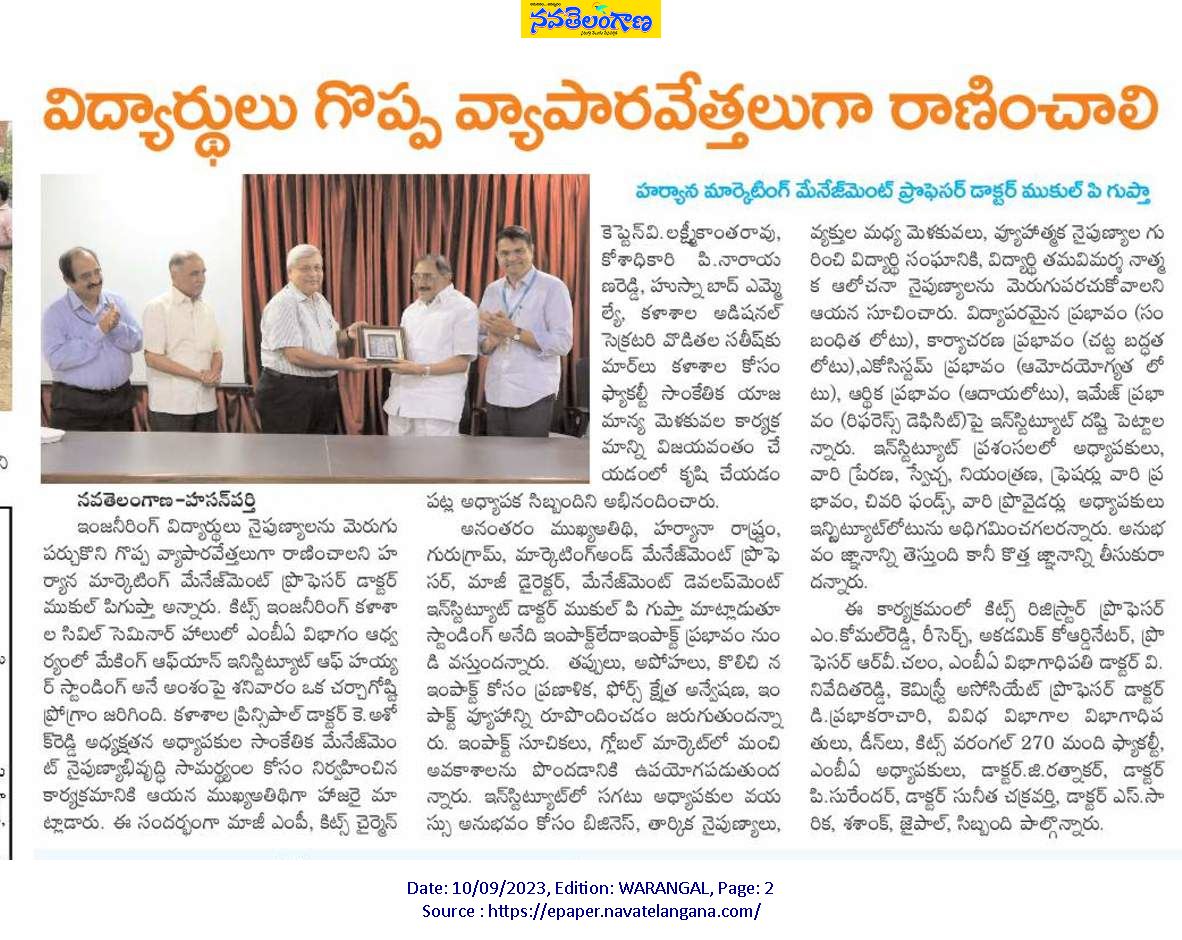 Talk on "Making of an Institute of Higher Standing" by Dr. Mukul P.Gupta, Professor of Marketing and Management, Management Development Institute (MDI), Gurugram - 9th September, 2023 @ KITS, Warangal