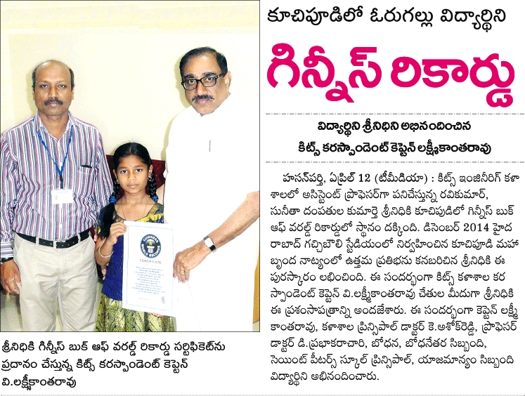 Appreciation by KITSW Secretary & Correspondent to Srinidhi for her Gunnies Book Record .