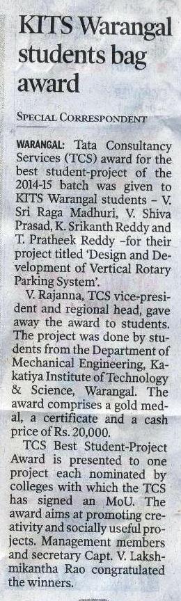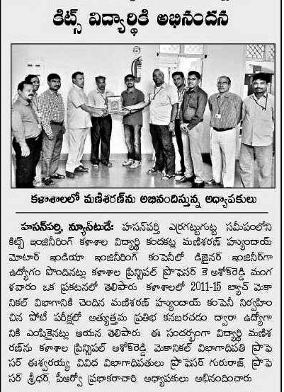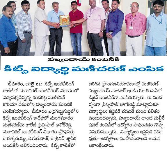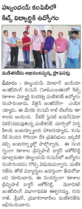 Manicharan of B.Tech. IV year ME student selected for Hyundai Company