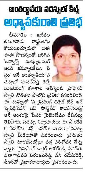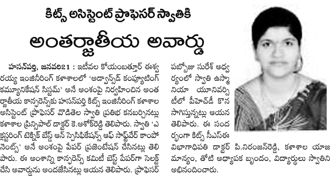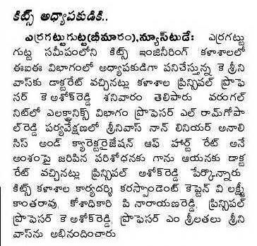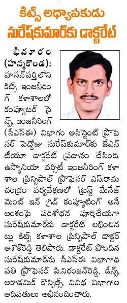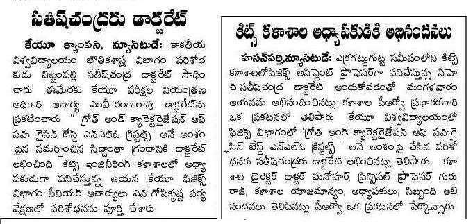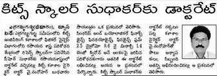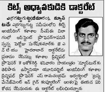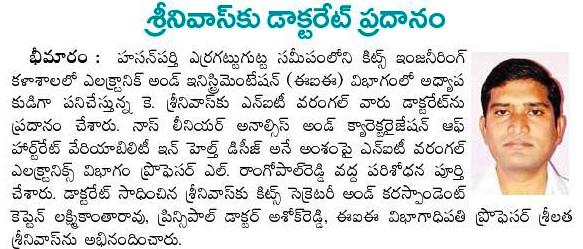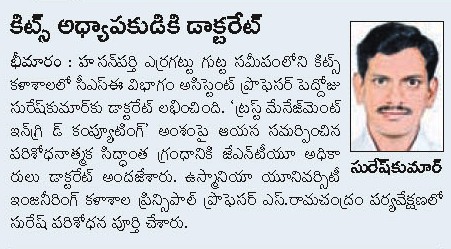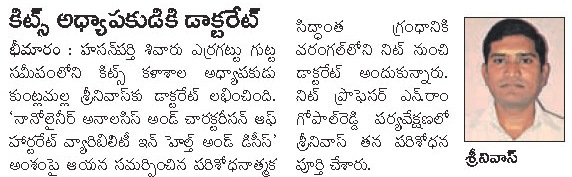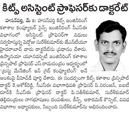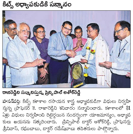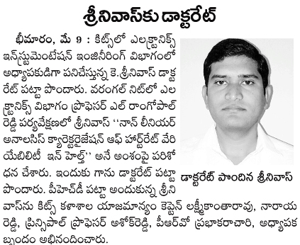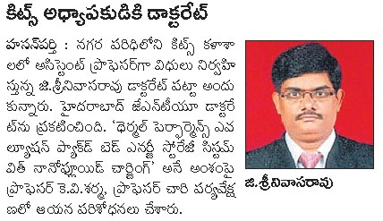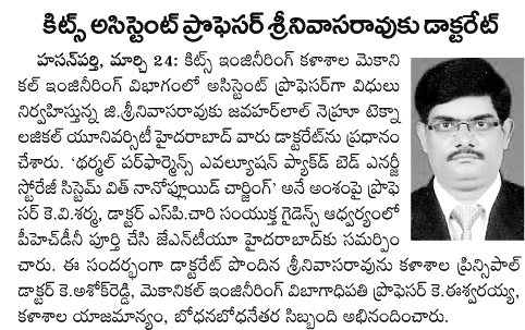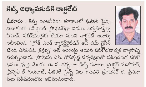 Doctorate Awarded to KITS Chemistry Research Scholar