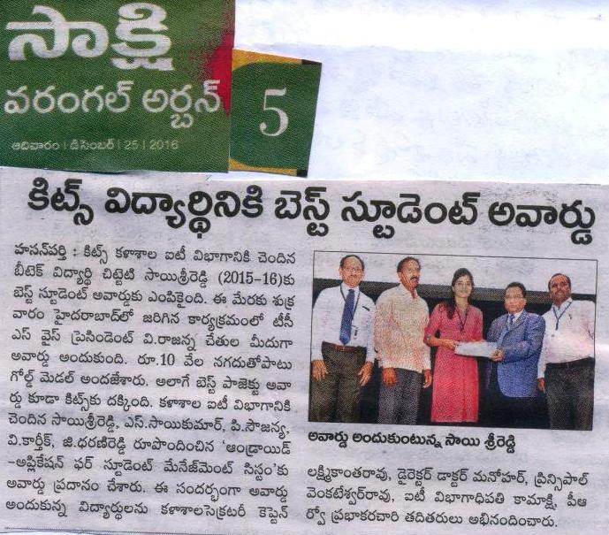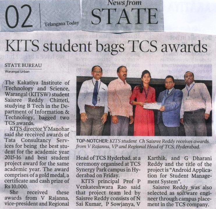 KITSW IT dept.Student bags TCS Best Student Award