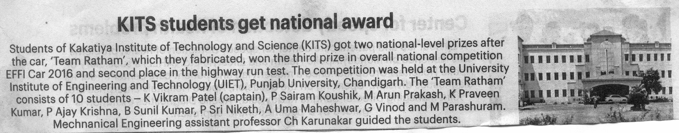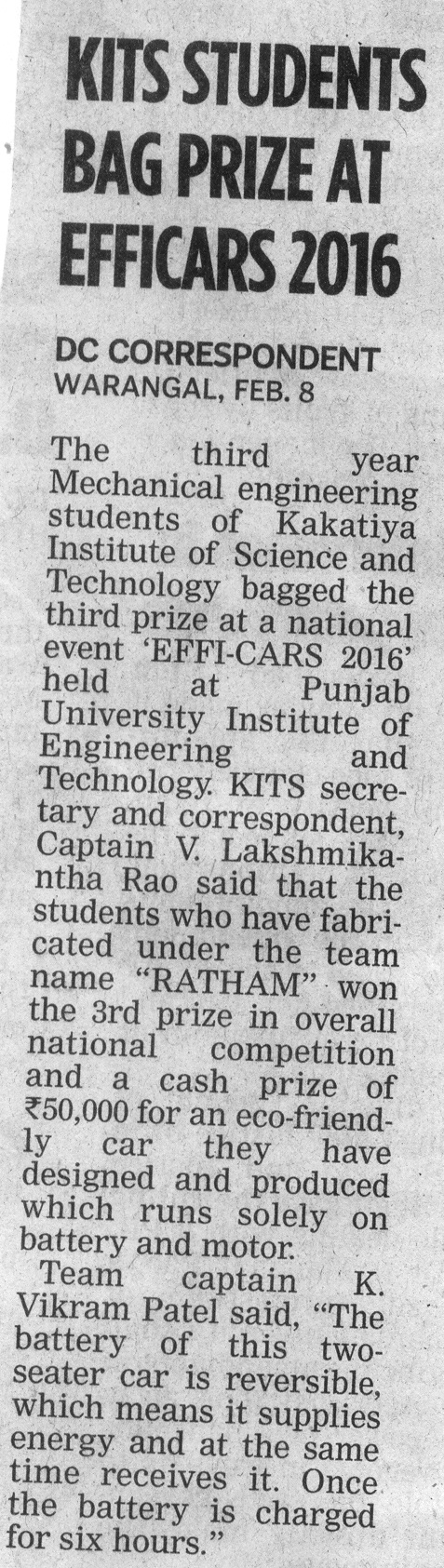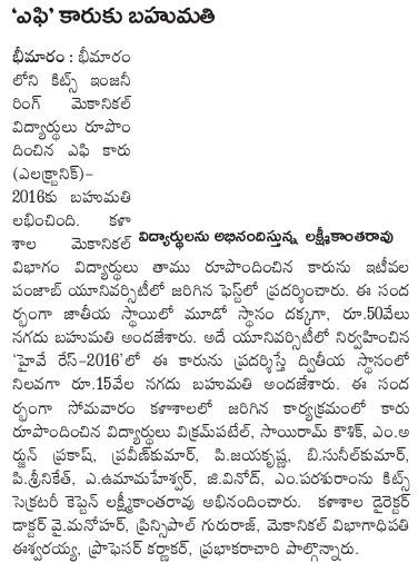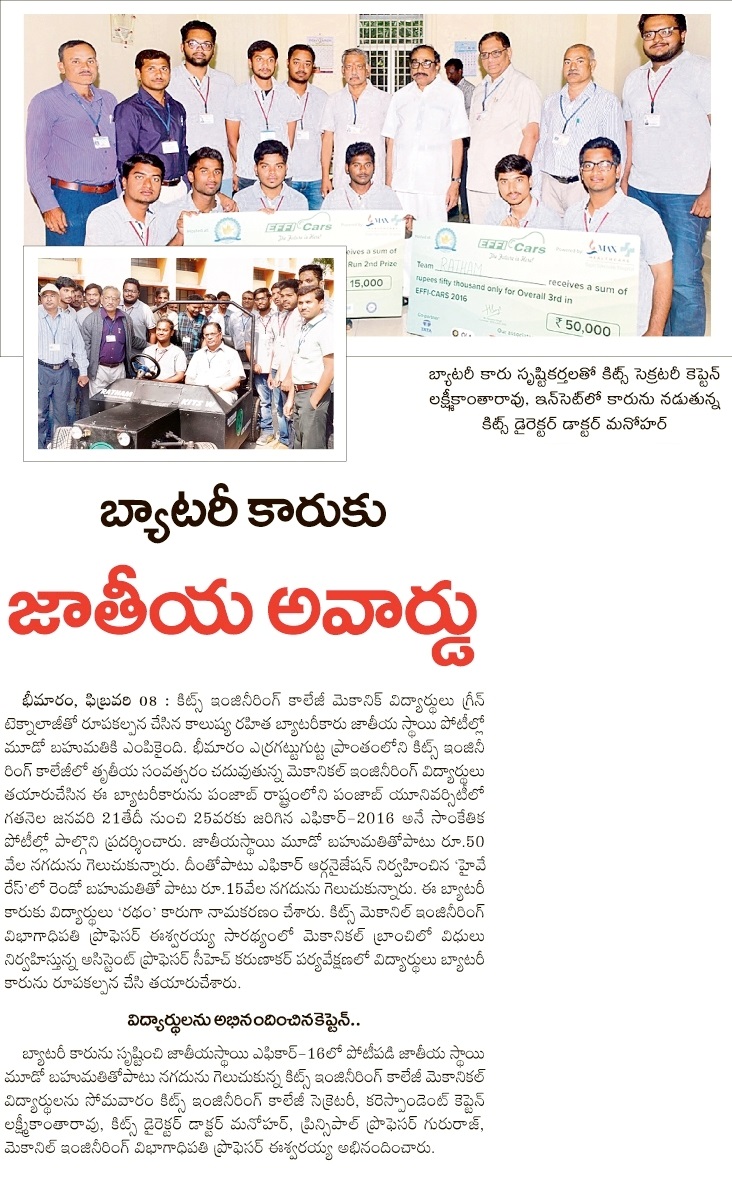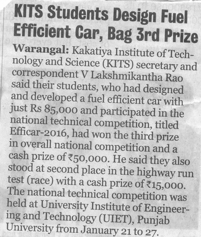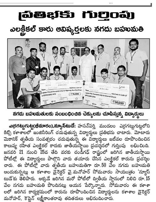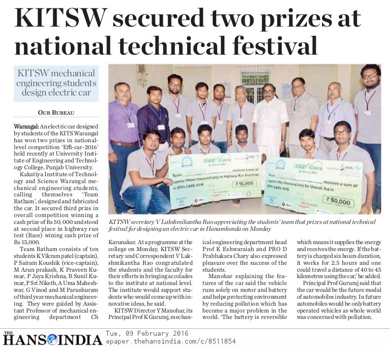 KITSW Mech Students Bag Prize at EFFICARS-2016
