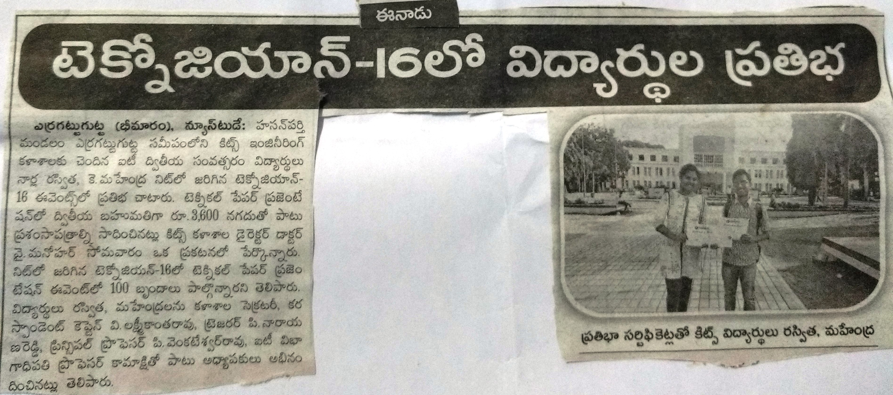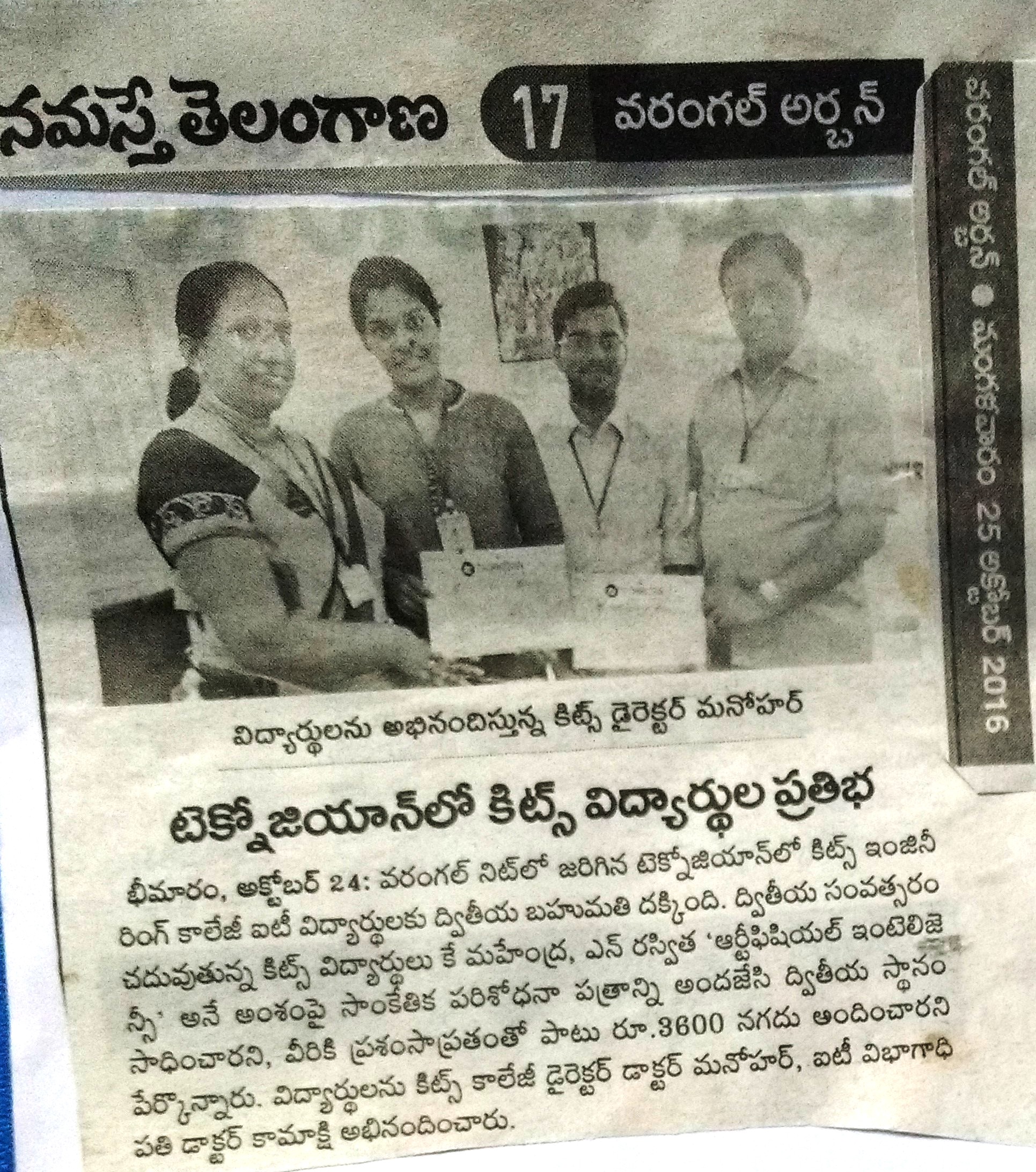 KITSW Students won the prizes in NITW's TECHNOZIAN-16 event