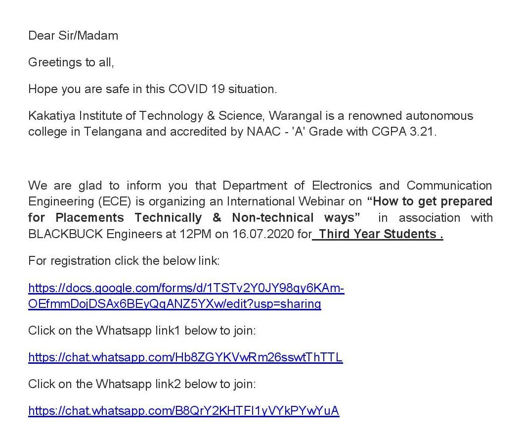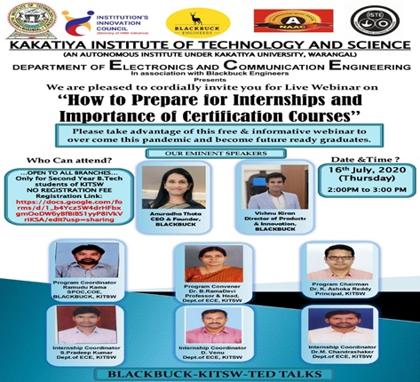 Organized an International Live Webinar on “How to prepare for Internships and Importance of Certification Courses” in association with BLACKBUCK Engineers Pvt. Ltd., at 3:00 PM to 4:00 PM on 16.07.2020 for Third Year Students.
