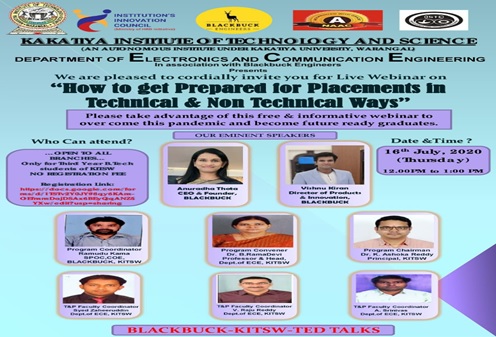 Organized an International Live Webinar on “How to get prepared for Placements Technically & Non-technical ways” in association with BLACKBUCK Engineers Pvt. Ltd., at 12:00 PM to 1:00 PM on 16.07.2020 for Final Year Students.