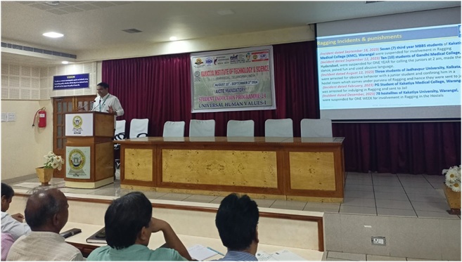 ![]() Prof. K. Ashoka Reddy, Principal addressing the faculty& students on ragging incidents and punishments on the eve of Anti- Ragging Sensitization programme held on August 30, 2024 |