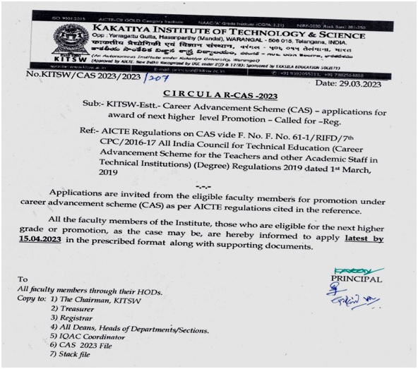 KITSW CAS Senior Professor (Level-15) application form March, 2023